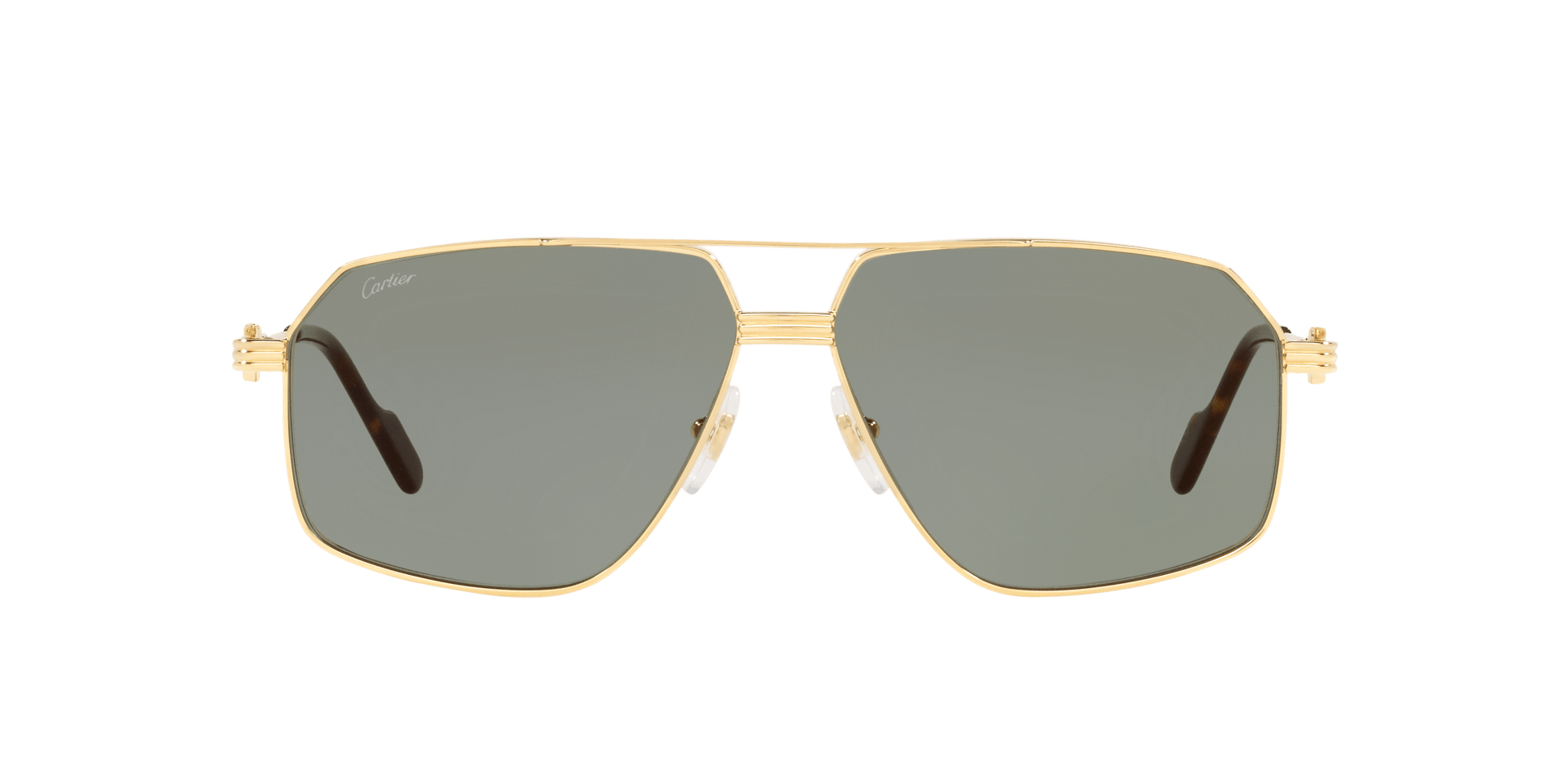 Elevate the pilot style to new heights with the Cartier CT0270S gold metal frame sunglasses, featuring solid green lenses. The iconic logo on the temple and gold metal details add an exclusive touch to this pilot design, ensuring durability and comfort. Embrace the timeless elegance of Cartier sunglasses with the gold metal pilot frame design and solid green lenses.
